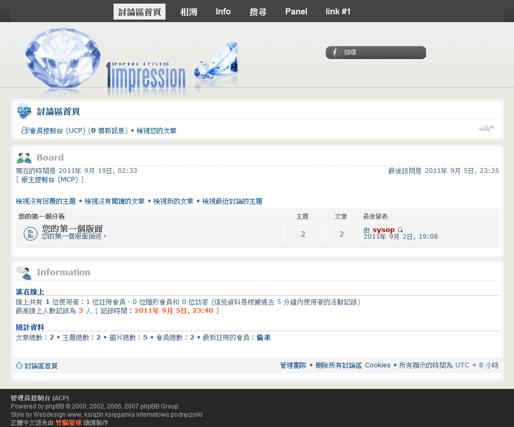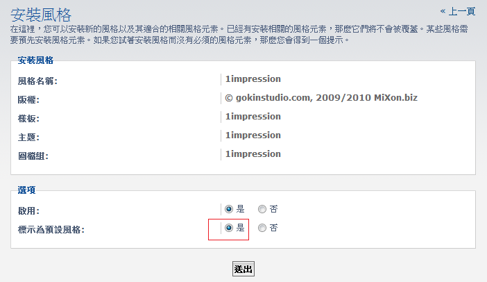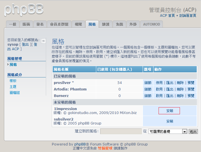接著利用管理員帳號登入ACP管理後台,安裝我們方才下載的風格目錄「1impression」。