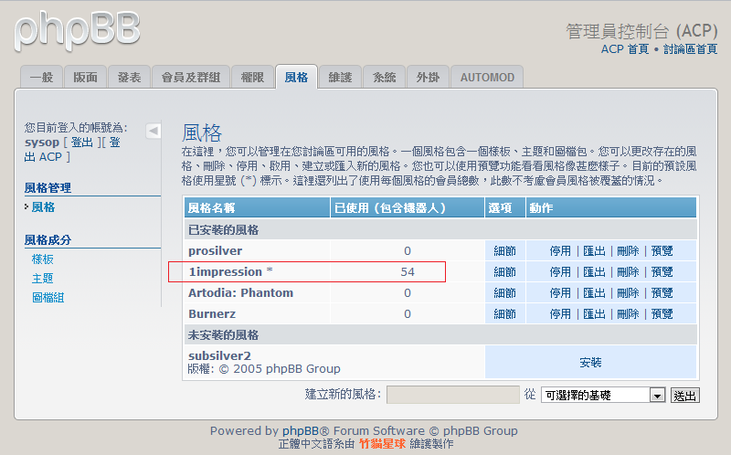 接著利用管理員帳號登入ACP管理後台,安裝我們方才下載的風格目錄「1impression」。