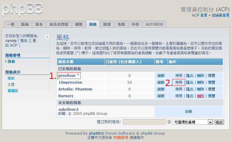 假設我們要將論壇套用風格改為Prosilver,需要在風格選項中的「細節」裡將欲變更的風格「啟用」與「標示為預設風格」。