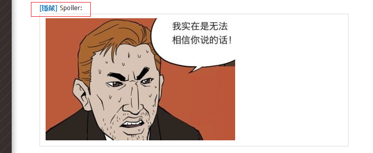 Prime BBcode的Spoiler區塊預設為全黑顯示,假如您希望是本論壇的顯示方式,那麼您可以修改JavaScript檔案「prime_bbcode_spoiler.js」,找到 "spoiler_collapse = false", 將它的值改為"true"。